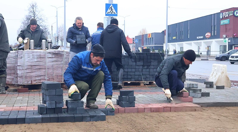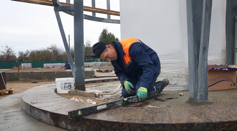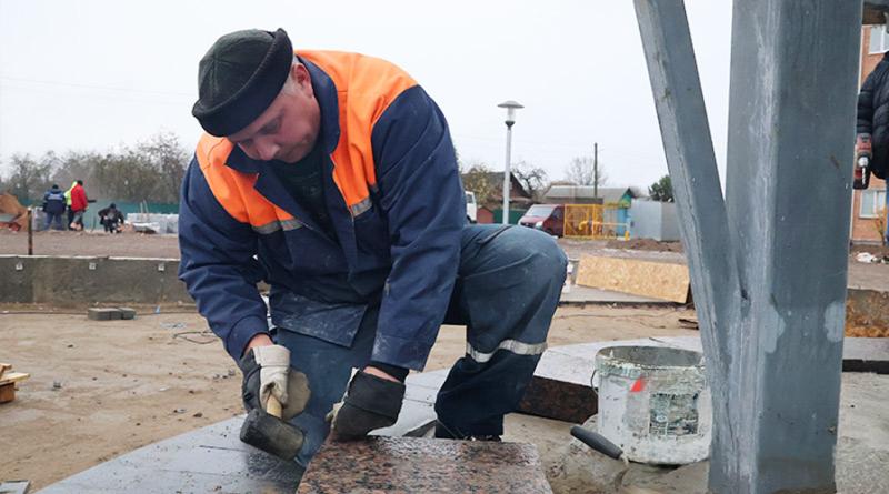 Участники субботника облицовывали парапеты керамогранитом, оборудовали пешеходные дорожки, выполняли устройство газонов, убирали строительный мусор.